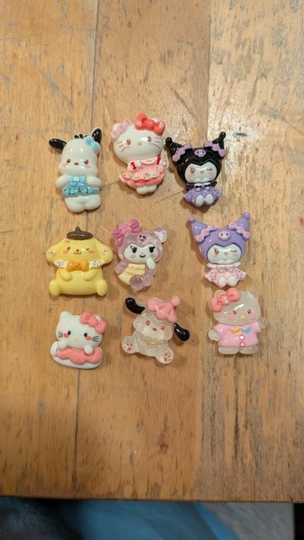 Detta är ett paket med 9 Sanrio cabochons. De är tillverkade av resin och har olika Sanrio-karaktärer som Hello Kitty, Pompompurin, Cinnamoroll, My Melody, Kuromi och Pochacco. Dessa cabochons kan användas för att dekorera telefonfodral, hårspännen, smycken eller andra pysselprojekt.