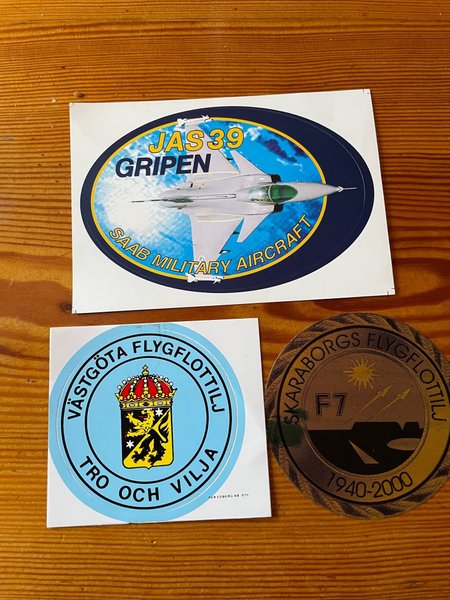 Dekaler med motiv av JAS 39 Gripen, Västergötlands flygflottilj och Skaraborgs flygflottilj (F7).Klistermärken