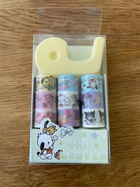 Säljer här en förpackning med 1 tejphållare och 9 söta minitejper,kan finns dubbletter. Tejpen är 1cm bred men finns ingen info om längden.