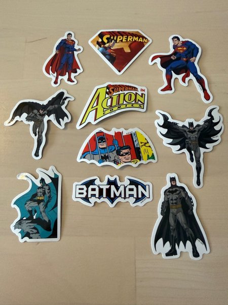 Ett set med klistermärken föreställande karaktärerna Superman och Batman. Klistermärkena inkluderar olika motiv av Superman, såsom hans logotyp och i olika poser. Det finns även klistermärken med Batman, inklusive hans logotyp och i olika actionscener, samt ett motiv med Batman och Robin. Storlek ca 6cm, Samfraktar gärna flera objekt.
