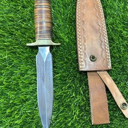 This handcrafted dagger features a sleek design with a Damascus steel blade and a comfortable Micarta and steel bolster handle. It includes a durable leather sheath for safe storage and easy carrying. Ideal for collectors or as a reliable tool for outdoor use, this knife blends performance with craftsmanship.