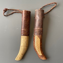 En handgjord knivslida i läder med detaljer i metall. Slidan har en unik design och är praktisk för förvaring av knivar. Mått och specifikationer kan diskuteras vid intresse.