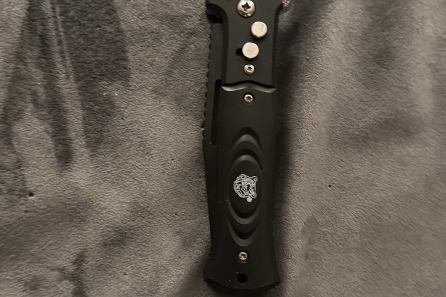Svart fällkniv med tigerlogotyp på handtaget. Kniven har en knappmekanism och är kompakt i storlek.