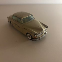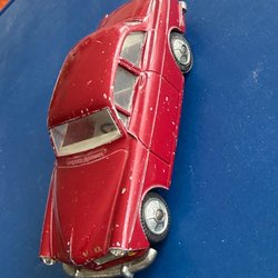 Denna modellbil är en detaljerad replika av en Volvo Amazon, tillverkad av Tekno i Danmark. Bilen är röd med vita däck och har "VOLVO Amazon" samt "810 Tekno Danmark" ingraverat på undersidan.