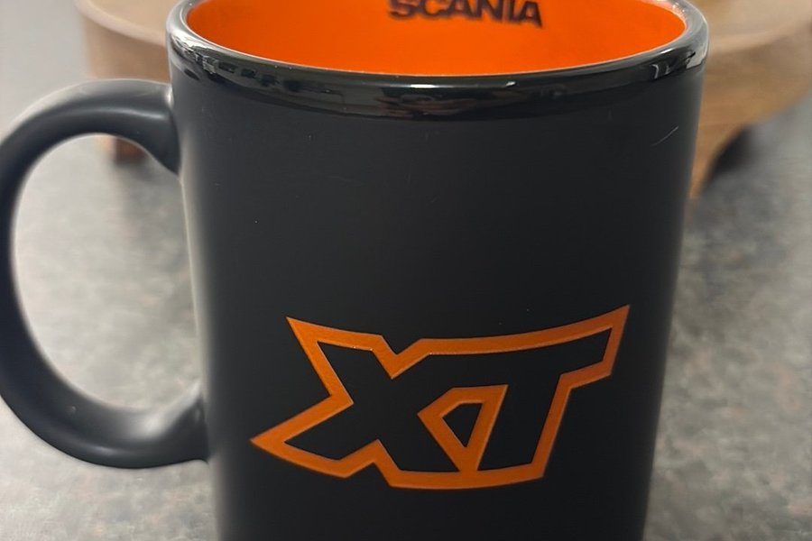 Svart mugg med orange insida. "SCANIA" är tryckt på insidan av muggen. "XT" är tryckt i orange på utsidan av muggen.