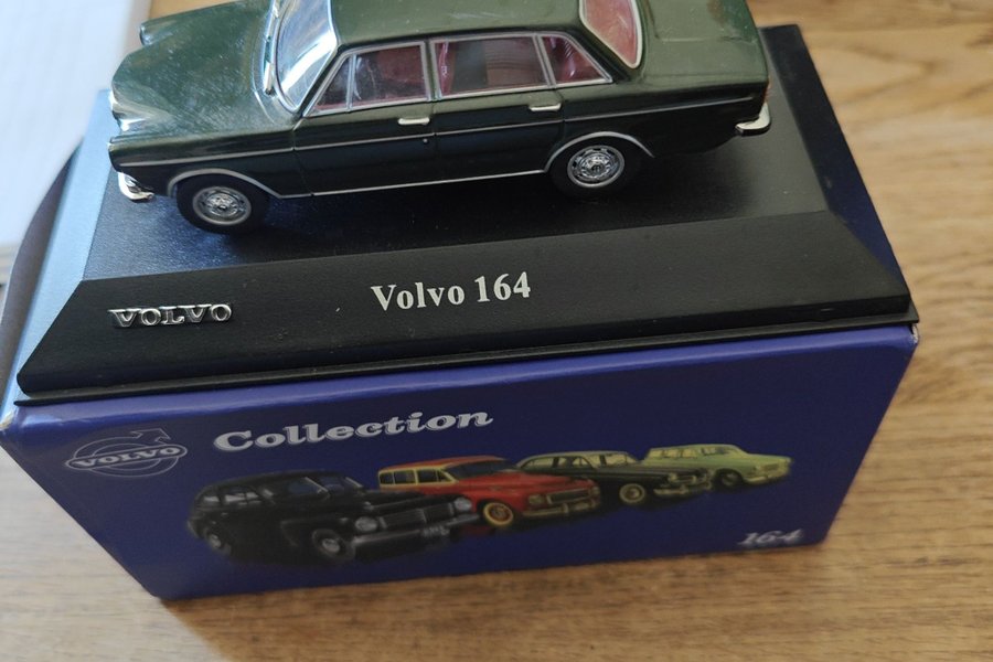 Denna samlarbil är en detaljerad modell av en Volvo 164. Bilen är grön med röd interiör och presenteras på en svart bas med texten "Volvo 164". Basen är placerad i en blå kartong med "Volvo Collection" tryckt på sidan, tillsammans med bilder på andra Volvo-modeller.