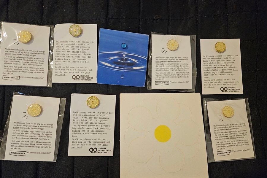 Samling av Majblomman pins. Årets majblomma. Majblomman finns för att alla barn i Sverige ska kunna tro på sig själva och drömma fritt oavsett ekonomiska förutsättningar. Majblomman samlar in pengar för att ge ekonomiskt stöd till barn i familjer där pengarna inte räcker till.