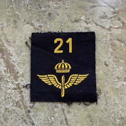 Tygmärke med fyra gula streck på en mörk bakgrund.