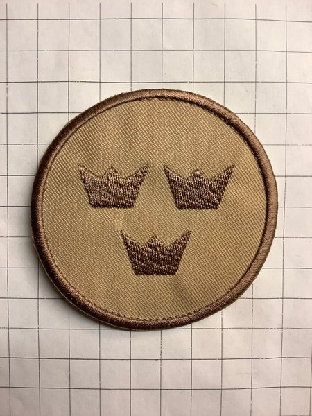Broderad tygmärke i form av en oval med tre kronor i mitten. Märket har en brun kant.