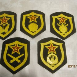 Här är en samling av fem distinkta märken, alla med en liknande design. Varje märke har en svart bakgrund och en guldfärgad sköldformad ram. Inuti ramen finns en röd stjärna med hammaren och skäran, ovanför en unik symbol som representerar olika militära grenar eller specialiteter.