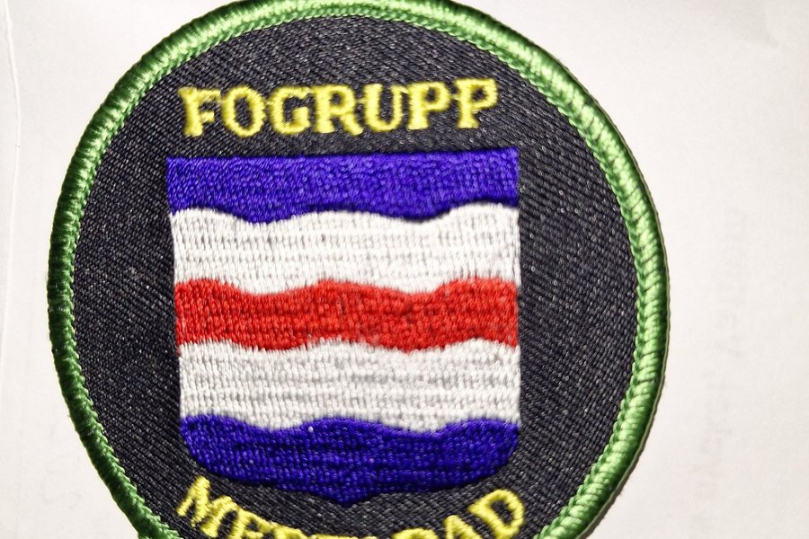 Rund tygmärke med texten "FOGRUPP MEDELPAD" broderad i gult. I mitten finns en sköld med blått, vitt och rött fält.