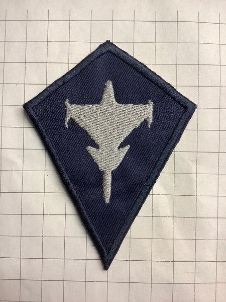 Blå tygmärke med en broderad bild av ett flygplan i mitten. Märket har en diamantform. Obs replika ej original.