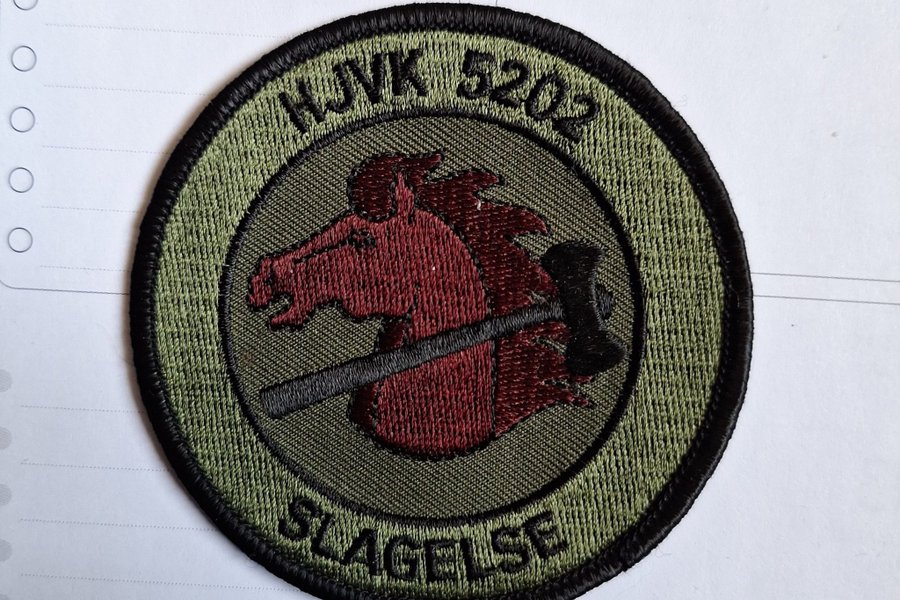 Rund tygmärke med texten "HJVK 5202 SLAGELSE" och en bild av ett hästhuvud med en slägga.