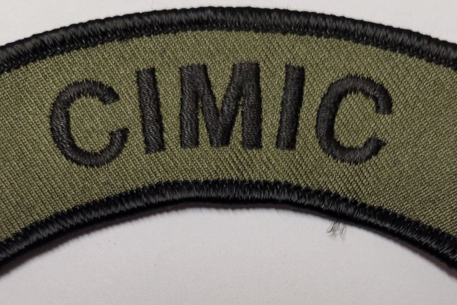 Ett olivgrönt tygmärke med texten CIMIC broderad i svart. Märket har en svart kant.