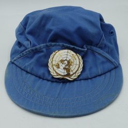 Blå rund patch med texten "UNITED NATIONS NATIONS UNIES" broderat i vitt runt en vit broderad symbol som liknar en världskarta omgiven av lagerkransar. Kardborre!