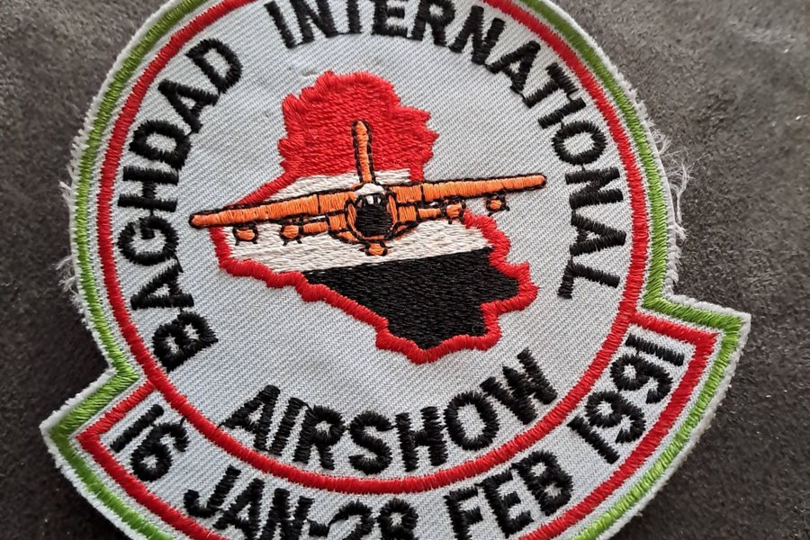Een geborduurde patch met de tekst 'Bagdad International Airshow 16 Jan-28 Feb 1991'. De patch toont een vliegtuig over een kaart.