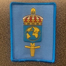 En broderad tygmärke med ett motiv av en blå bevingad lejonliknande varelse med en krona, placerad ovanpå en röd form med ett "C" i mitten, allt mot en gul bakgrund. Märket har en svart kant.