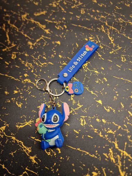 Nyckelring med Lilo & Stitch-tema. Den har en blå rem med texten "Lilo & Stitch" och en figur av Stitch som håller en blomma. Det finns även en mindre berlock formad som en spelkontroll med en rosett.