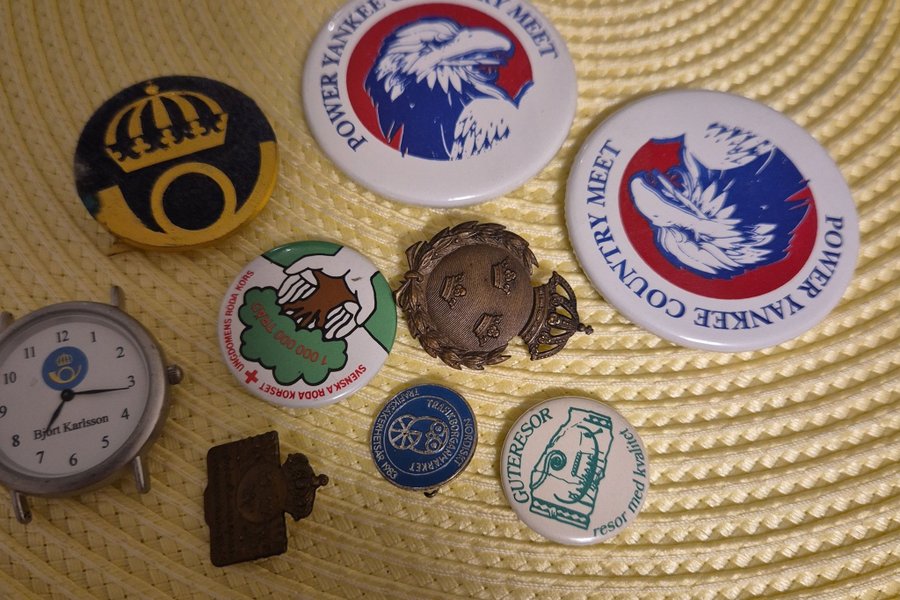 Samling av diverse pins och märken. Inkluderar bland annat märken från Power Yankee Country Meet, Svenska Röda Korset ungdomens 1 000 000 träd, Trafiksäkerhetsår 1983, Gutersor med kvalitet och ett postmärke samt en klocka med Björt Karlsson.
