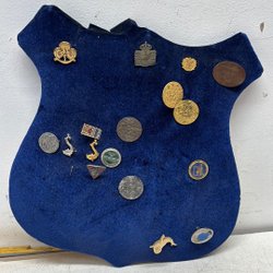 En samling av diverse märken, inklusive märken från föreningar och organisationer.Höjd ca 27x22 cm.