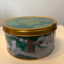 Plåtburk med motiv av Mumin karaktärer. Tillverkad för Martinex.