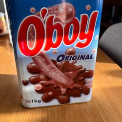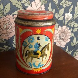 Fyrkantig plåtburk från Söstrene Grene med motiv av barn under ett paraply i snö.
