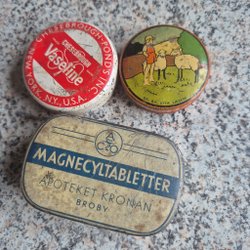 Vintageplåtaskar från det spanska varumärket Heno de Pravia, som ursprungligen innehöll tvål eller andra hygienprodukter.