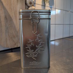Kaffeburk i plåt med ett handtag på locket. Burken är blågrön och har texten ”Kaffe” tryckt i rött på framsidan. Höjd 16 cm exkl. handtag. Bra skick!