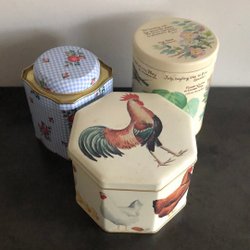 Tre plåtburkar med olika motiv.