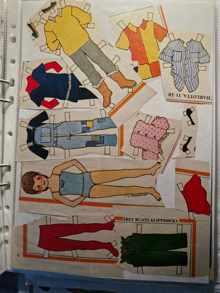 Klippdocka med tillhörande kläder. Kläderna inkluderar en gul tröja med grå byxor och bruna stövlar, en röd och gul topp, en blårandig skjorta, en mörkblå jacka med röda ärmar, blå hängselbyxor, en rosa prickig klänning, svarta skor, röda byxor och en grön klänning.