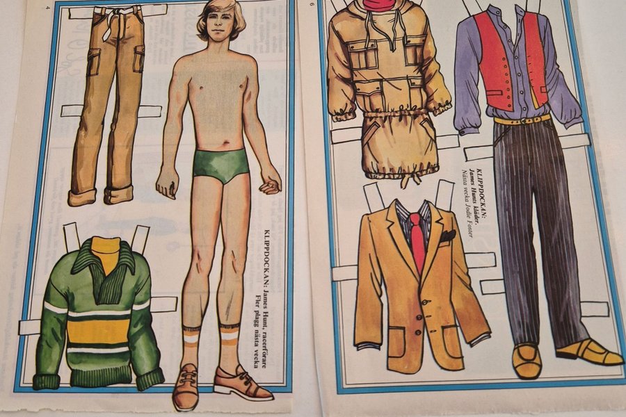 Klippdocka föreställande racerföraren James Hunt. Arket innehåller en klippdocka och flera olika klädesplagg och accessoarer.