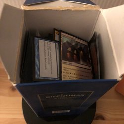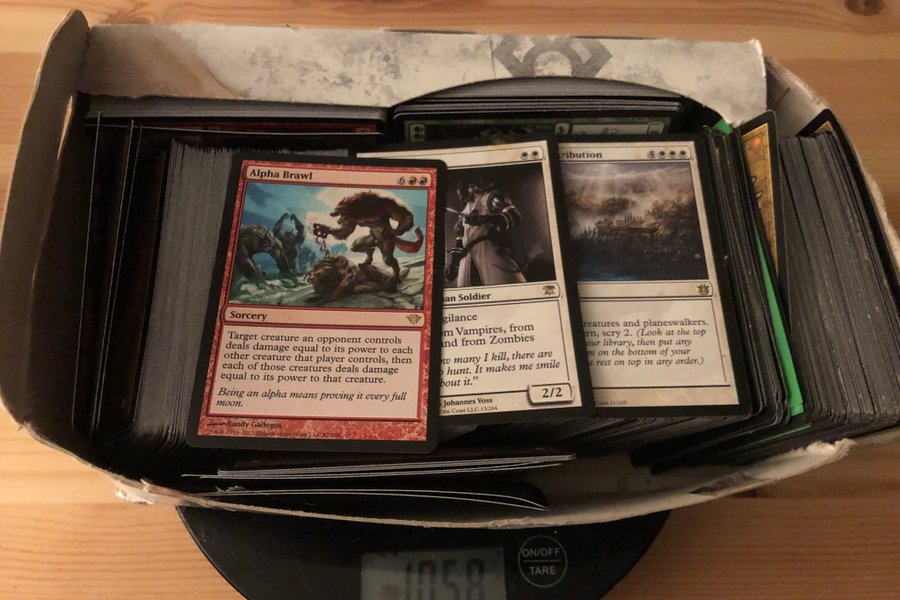 Lite över kilot Magic the Gathering-kort, utöver synliga rares blandad commons och uncommons från Innistrad - Journey into Nyx-eran.
