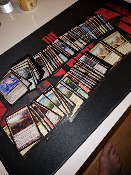 Ett parti med Magic the Gathering-kort, inklusive olika landkort som "Encroaching Wastes", "Tramway Station" och "Unknown Shores". Korten kommer från olika upplagor, bland annat M21 och M14.
