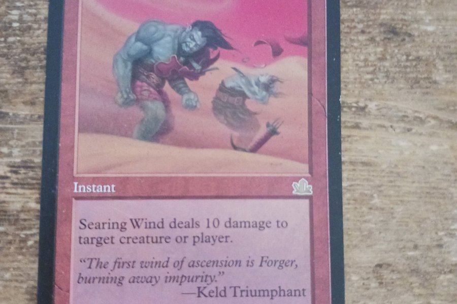 Searing Wind är ett Instant-kort som tillfogar 10 skada på en varelse eller spelare. Kortet är illustrerat av John Matson och har texten "The first wind of ascension is Forger, burning away impurity." —Keld Triumphant. Det är från 1993-2000 Wizards of the Coast, Inc. och har kortnummer 103/143.