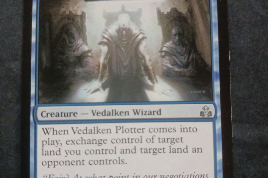 Magic the Gathering-kortet Vedalken Plotter. Kortet är en varelse – Vedalken Wizard med kostnaden 2 och en blå mana. När Vedalken Plotter kommer in i spel, byt kontroll över ett land du kontrollerar och ett land en motståndare kontrollerar. Kortet har styrkan 1 och tåligheten 1.