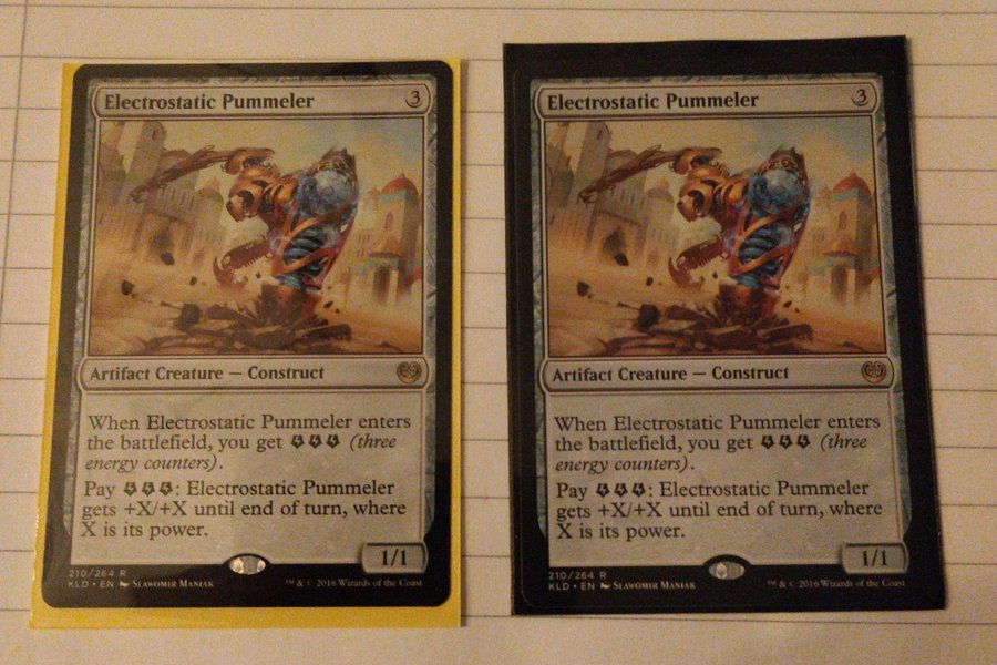 Kortet "Electrostatic Pummeler" från Magic: The Gathering. Det är ett artefaktvarelse – konstrukt med en manakostnad på 3. När Electrostatic Pummeler kommer in på slagfältet får du tre energiräknare. Du kan betala tre energiräknare för att Electrostatic Pummeler ska få +X/+X fram till slutet av turen, där X är dess styrka. Kortet har styrka och tålighet 1/1.