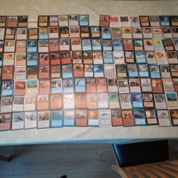 En låda med Magic: The Gathering-kort. Korten är av olika typer. Dom är spelade med på 90talet.