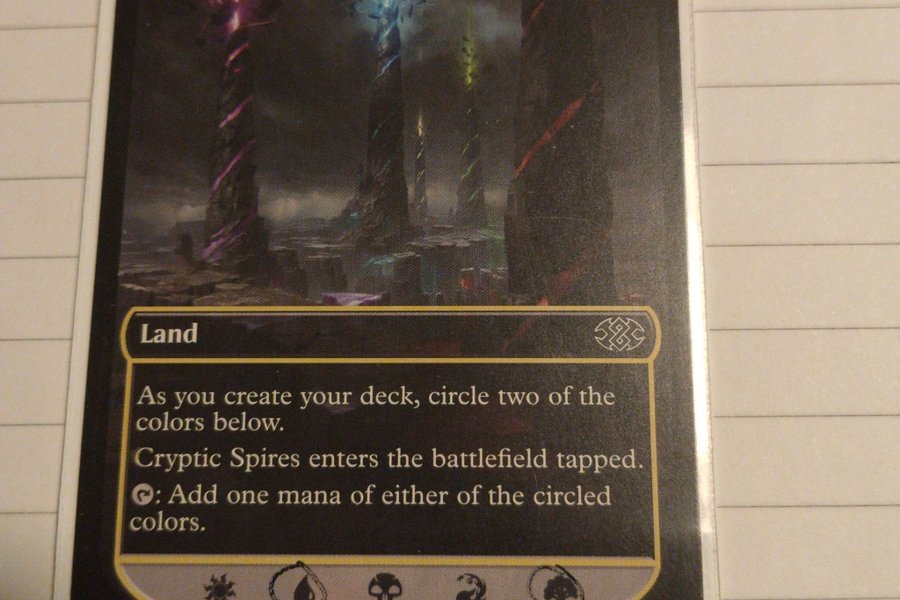 Kortet "Cryptic Spires" är ett landkort. När du skapar din lek, välj två färger. Kortet kommer in i spel tappat. Lägg till ett mana av någon av de valda färgerna.