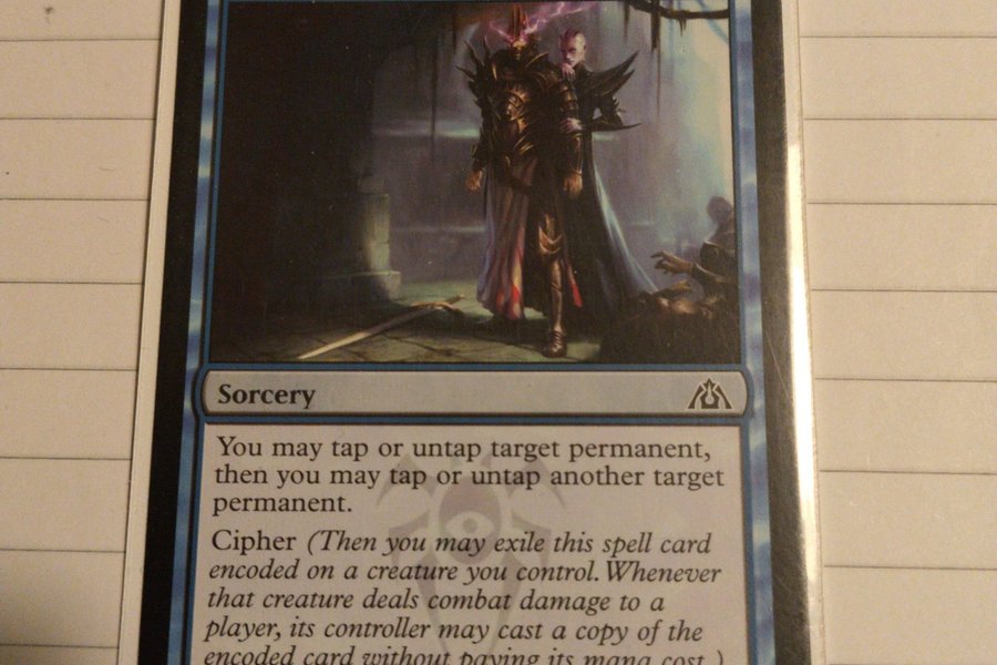 Kortet "Hidden Strings" från Magic the Gathering. Mana: 1 blå, 1 färglös. Typ: Sorcery. Text: Du får tappa eller otappa en permanent, sedan får du tappa eller otappa en annan permanent. Chiffer (Du får exila denna trollformel kodad på en varelse du kontrollerar. När den varelsen tillfogar en spelare stridsskada, får dess kontrollant spela en kopia av det kodade kortet utan att betala dess manakostnad.) Illustratör: Daarken. Set: Gatecrash. Kortnummer: 12/156.