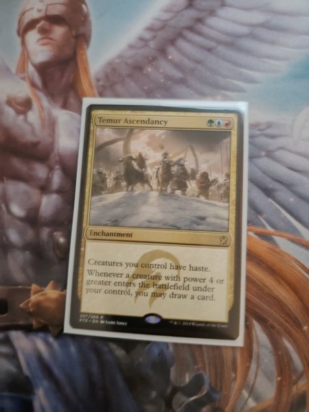 Temur Ascendancy är ett förtrollningskort. Kortet ger varelser du kontrollerar Haste. När en varelse med styrka 4 eller högre kommer in på slagfältet under din kontroll, får du dra ett kort. Kortet är från 2014 och illustrerat av Jaime Jones.