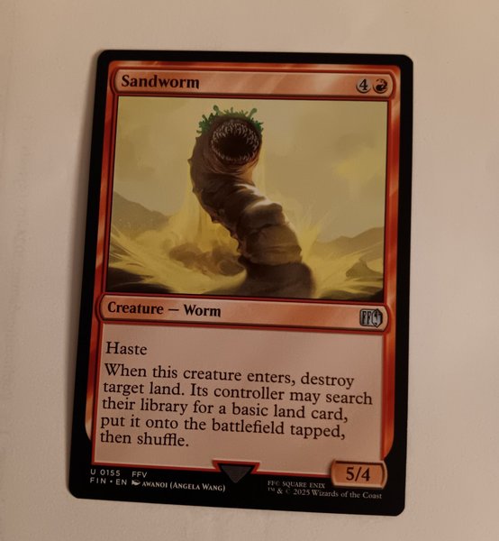 Magic The Gathering kortet Sandworm från Final Fantasy kollektionen. Den har Haste och förstör en land när den kommer in i spelet.