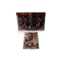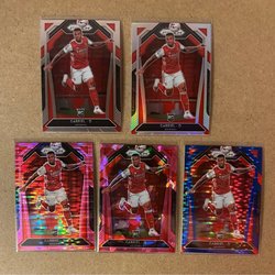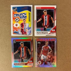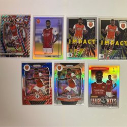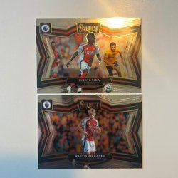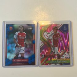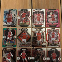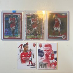 Samling av Arsenal fotbollskort med spelare som Declan Rice, Bukayo Saka, Kai Havertz, Gabriel Martinelli, Leandro Trossard, David Raya, Ben White, Jorginho, Thierry Henry och Myles Lewis-Skelly.