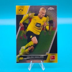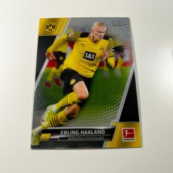 Säljer ett samlarkort av Erling Haaland från Topps Chrome Chasing Glory-serien. Kortet föreställer Haaland i Borussia Dortmund-tröja.