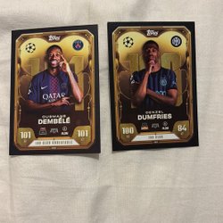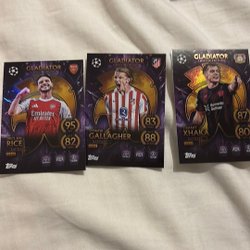 Fotbollskort med spelare som Lionel Messi, Neymar Junior, Paul Pogba, Alphonso Davies, Pedro Porro, Alessandro Florenzi och Atakan Karazor.