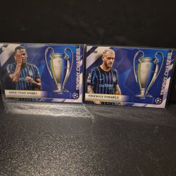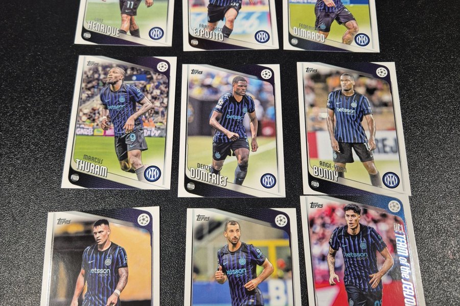 Nio Topps Champions League fotbollskort med spelare från Inter Milan. Korten inkluderar Luis Henrique, Francesco Esposito, Federico Dimarco, Marcus Thuram, Denzel Dumfries, Ange-Yoan Bonny, Lautaro Martinez, Henrikh Mkhitaryan och Alessandro Bastoni.