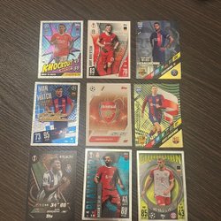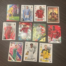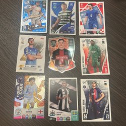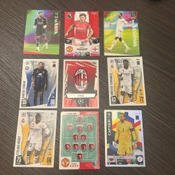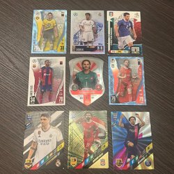 Samling av fotbollskort med spelare som Christian Eriksen, Luka Modric, Pedri, Gavi, Almada, Aurelien Tchouameni, Manuel Neuer, AC Milan lagkort och Deco.