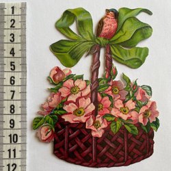 Två äldre bokmärken med motiv av en flicka med blommor och en skottkärra med blommor.