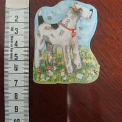 föreställande en flicka i rosa klänning som håller i en blomma. Flickan står på en grön bas med flera blommor i olika färger. Bilden är färgglad och detaljerad.