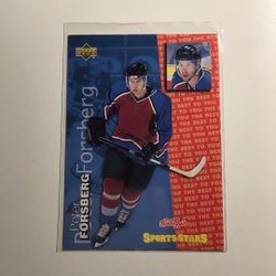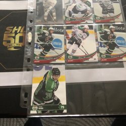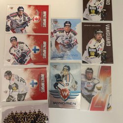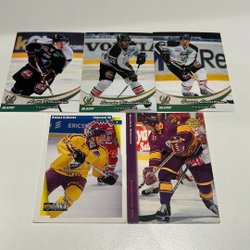 Hockeykort med spelare som Roger Rosén, Håkan Loob, Daniel Tjärnqvist, Arto Ruotanen och Magnus Swärdh.