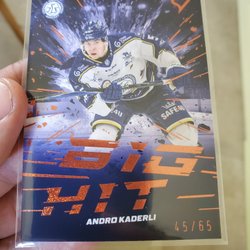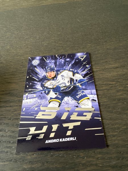 Hockeykort föreställande Andro Kaderli i matchställ. Kortet har texten "Big Hit" och spelarens namn nedtill.